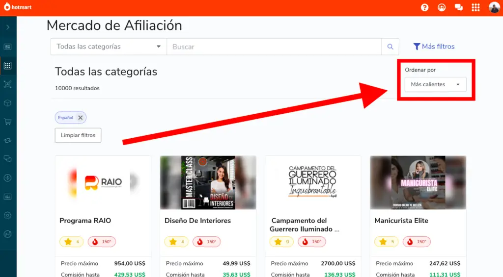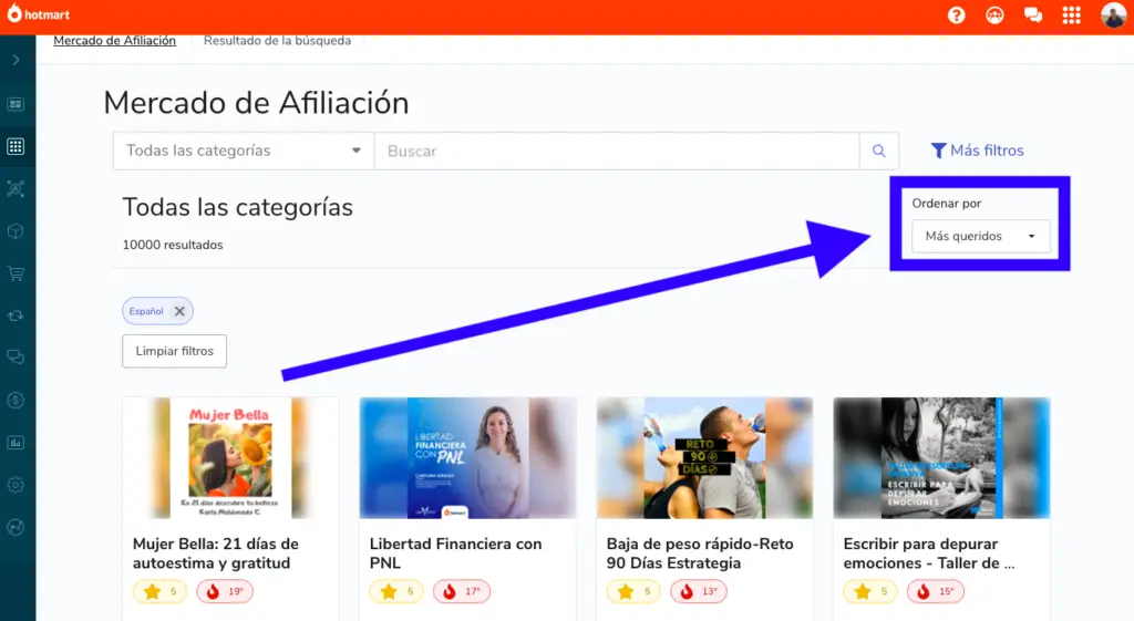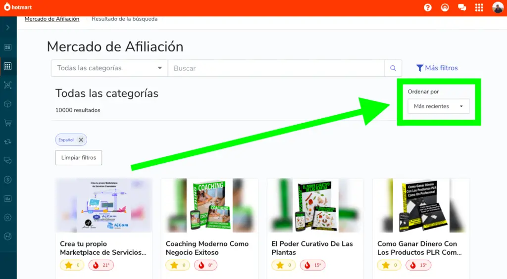 Également dans la section « Marché d’affiliation » de Hotmart, en plus des mesures expliquées ci-dessus, vous disposez de différents onglets pour faciliter le choix des produits à rejoindre en tant qu’affilié.
