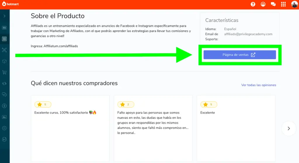 Dans Hotmart, lorsque vous cliquez sur chaque info produit pour obtenir plus d’informations, il y a un onglet appelé » A propos du produit «, c’est là que vous trouverez le lien vers la page de vente.