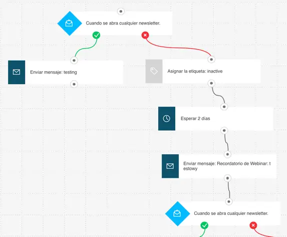 L’image montre un workflow créé dans GetResponse dans lequel vous pouvez envoyer des messages en fonction de certains comportements de vos abonnés.