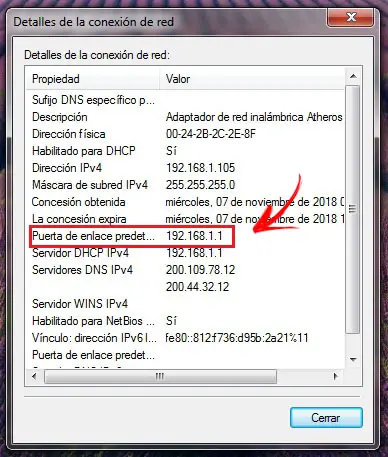 - Enfin, cherchez où il est dit «Passerelle par défaut» . De cette façon, vous pourrez connaître l’adresse IP de votre routeur.
