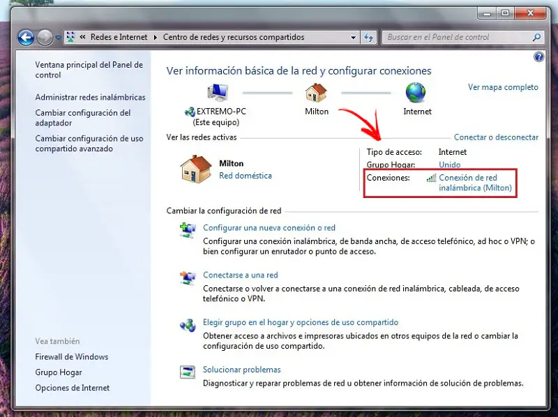- Dans la fenêtre «Informations de base du réseau et paramètres et connexions» , recherchez et cliquez sur le nom de votre réseau.