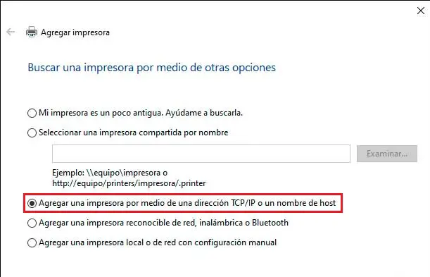- Dans l’assistant qui a été affiché, nous sélectionnerons «Ajouter une imprimante au moyen d’une adresse TCP / IP ou d’un nom d’hôte».