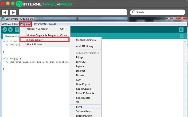 - Une fois que vous sélectionnez cet onglet, cliquez sur l’option qui indique «Inclure la bibliothèque» et ainsi, un menu s’affichera à partir duquel vous devrez choisir le moteur utilisé (par exemple, «Servo» ).