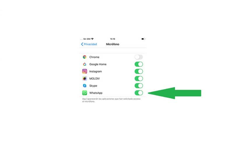 - Il vous montrera toutes les applications que vous avez installées sur votre iPhone et qui peuvent avoir accès au microphone. Localisez celui qui nous concerne dans cet article, WhatsApp et déplacez le bouton vers la droite, il devrait être vert.