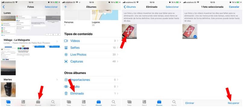 Sélectionnez les photos que vous souhaitez enregistrer et appuyez sur l’option «Récupérer» et c’est tout! vous retrouverez les photos sélectionnées dans les dossiers et albums d’où vous les avez supprimées par erreur. N’oubliez pas que si vous ne les restaurez pas à partir de cet espace dans 30 jours, ils seront complètement supprimés et il sera plus difficile de les récupérer. Et pour être plus sûr, vous pouvez transférer les photos, vidéos et fichiers de votre iPhone vers le PC , et ainsi, s’ils sont à nouveau supprimés, vous avez déjà une sauvegarde sur votre ordinateur.