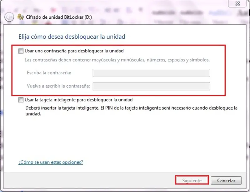 Ensuite, une fenêtre apparaîtra dont le nom est «BitLocker Drive Encryption» qui nous donne deux options; l’un pour crypter le lecteur avec un mot de passe et l’autre pour crypter le lecteur avec une carte à puce.