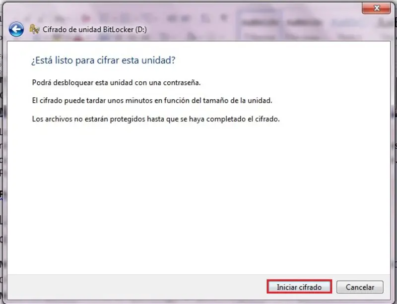 - Enfin, cliquez sur «Suivant» et il nous dirigera vers une fenêtre où il nous demandera si nous sommes prêts à crypter le lecteur sélectionné. Si nous sommes satisfaits de tout ce que nous avons choisi, cliquez sur «Démarrer le cryptage». De cette manière, notre unité sera cryptée, et le seul moyen de modifier ou d’altérer toute information stockée sur la clé USB est d’écrire la clé que nous avons désignée ou celle que le système nous a donnée en cas d’urgence.