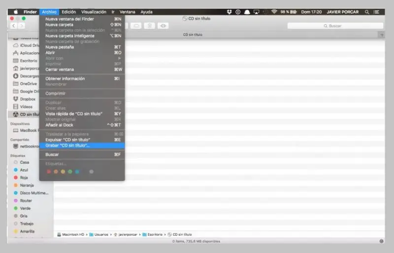 - Une fois le processus de copie terminé dans la fenêtre » Finder» , nous sélectionnons l’option » Fichier » puis » Graver «, en nommant notre disque.