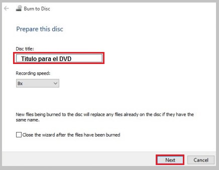 - Une fenêtre « Préparer ce disque » s’ouvre . Entrez le titre du disque, sélectionnez la vitesse d’enregistrement et cliquez sur » Suivant «. Les fichiers sélectionnés sont enregistrés sur le disque.