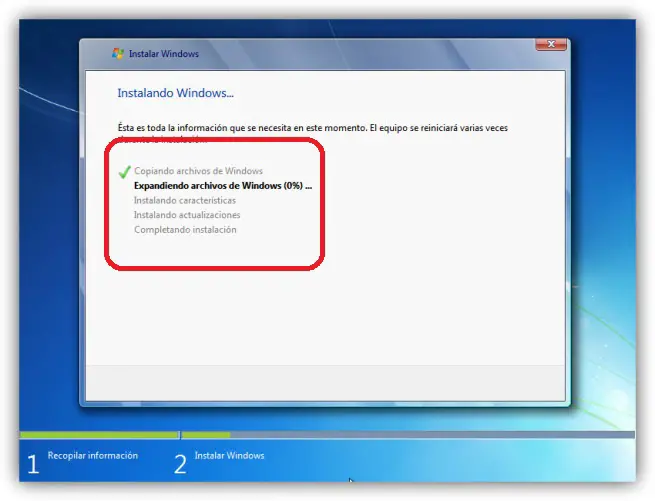 Avec ces étapes simples, le processus qui fera de notre périphérique de mémoire externe une clé USB amorçable commencera à installer Windows 7. Le processus peut prendre plusieurs minutes, vous pouvez donc aller aux toilettes ou regarder la télévision pendant que vous attendez .