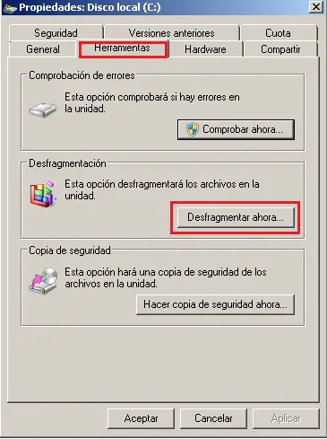 - Lorsque vous ouvrez les propriétés du disque, vous placerez immédiatement l’option outils en haut de la fenêtre. Lorsque vous ouvrez la liste des options, vous cliquerez sur » Défragmenter maintenant «.