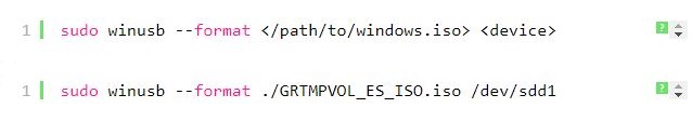 - Une fois le périphérique localisé et le chemin ISO (vous pouvez le trouver de la même manière que le périphérique), utilisez ce qui suit: sudo winusb –format </path/to/windows.iso> <device>