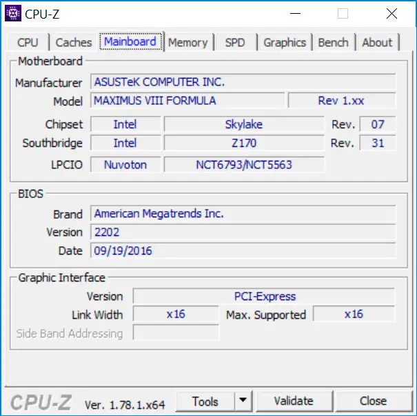 Vous aurez dans un seul écran, divisé en différents modules, les informations sur le CPU , la mémoire de la carte graphique, la mémoire RAM et bien sûr celle se référant à la carte mère. Pour trouver ces dernières informations, vous pouvez les trouver dans la partie inférieure gauche de l’écran. Vous aurez le chipset, le BIOS qu’il utilise, le nom et le fabricant de la carte.