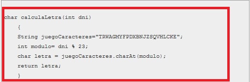 - Passez au codage en langage JAVA . L’algorithme fera ce que la fonction Excel a fait; calculer le module 23 à votre numéro DNI.