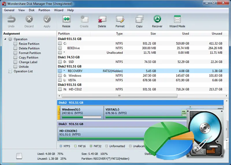 Bien qu’il s’agisse d’une option basique pour gérer les partitions de disque sur un ordinateur, elle est recommandée par les experts grâce à ses bonnes performances . Pour commencer, Wondershare Disk Manager n’est compatible qu’avec Windows XP, Vista et Windows 7. Concernant son interface, ce programme présente une plate-forme très simple et légère , qui ne présente aucune complication à utiliser.