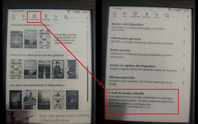 - Une fois cela fait, la société désignera un e-mail (*user*@kindle.com) qui vous aidera à envoyer les livres que vous souhaitez depuis l’appareil. Cette adresse peut être modifiée sur le site Amazon et en entrant les paramètres de votre compte.
