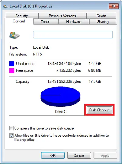 - Ensuite, cliquez sur «Nettoyage de disque» et attendez quelques secondes ou minutes pendant que l’outil W7 calcule l’espace qu’il sera possible d’effacer. Fondamentalement, le temps dépendra de l’encombrement sur le disque dur, car le processus de numérisation sera plus fastidieux.