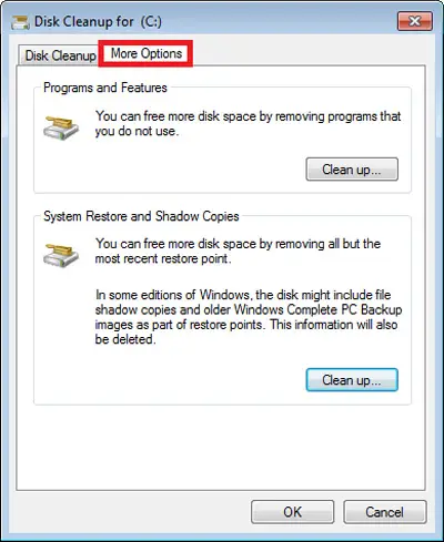 - Enfin, si vous souhaitez obtenir plus d’espace libre, vous pouvez cliquer sur l’onglet «Plus d’options» qui vous permet de nettoyer tous les programmes installés, ainsi que les points de restauration du système.