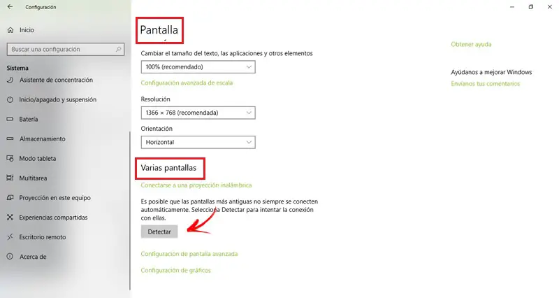 - Une fois les deux ordinateurs connectés au même réseau Wi-Fi, l’étape suivante consiste à accéder au PC, vous devez y entrer » Paramètres » puis » Système «> » Écran «> » Plusieurs écrans «> » Détecter «.