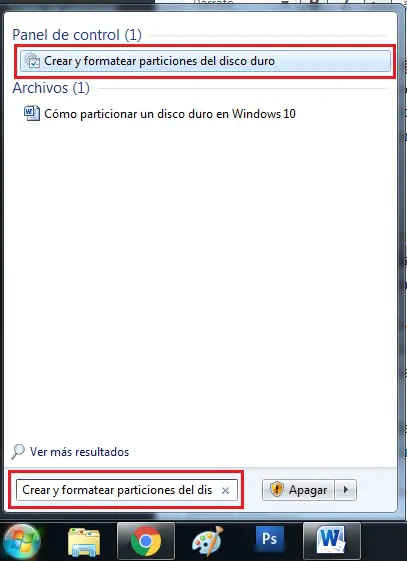 - Allez dans «Démarrer» et tapez dans le moteur de recherche «Créer et formater des partitions de disque.»