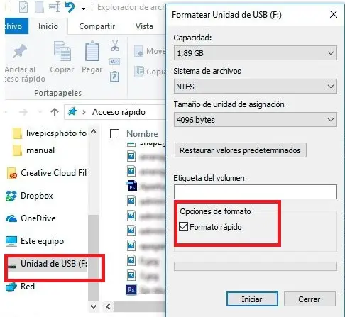 - Branchez la clé USB externe sur le PC . Une fois qu’il l’a reconnu, il doit vous montrer où il a été monté. Après cela, faites un clic droit sur la clé USB et sélectionnez «Formatage rapide».