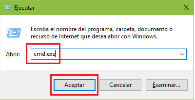- Ensuite, depuis l’ordinateur Windows, il faut chercher l’option » Exécuter «, on écrit cmd et enfin on clique sur accepter.