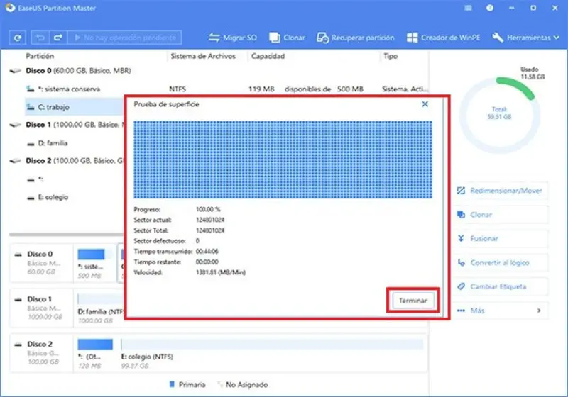 - Nous laissons le logiciel faire son inspection du disque et réparer automatiquement tous les secteurs concernés. Pour terminer, nous cliquons sur «Terminer» et le processus est automatiquement terminé.