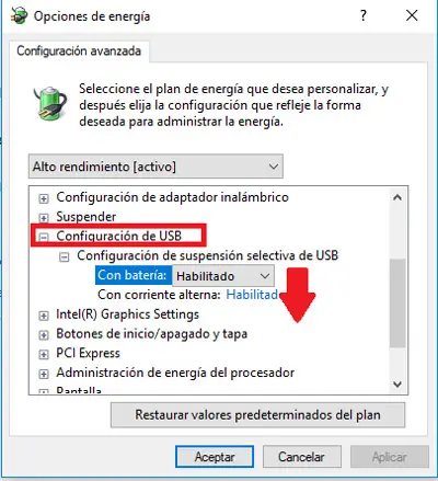 - Sélectionnez ensuite « Modifier les paramètres d’alimentation avancés ». Depuis lors, une nouvelle fenêtre s’ouvrira et là, recherchez » Paramètres USB » où ils vous montrent une option appelée » Paramètres de suspension sélective USB » qui sera sûrement activée et vous devez changer le menu déroulant sur » Désactivé «.