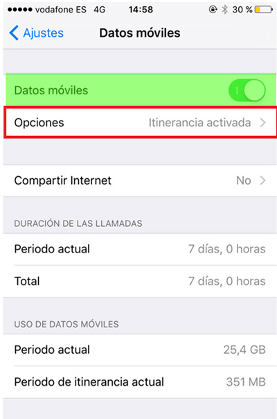 - Plus tard, recherchez et allez dans » Options » de cette fenêtre et vous accéderez à l’itinérance des données parmi d’autres options.