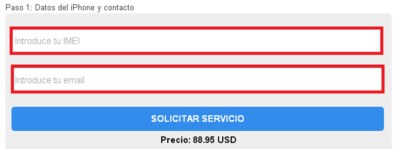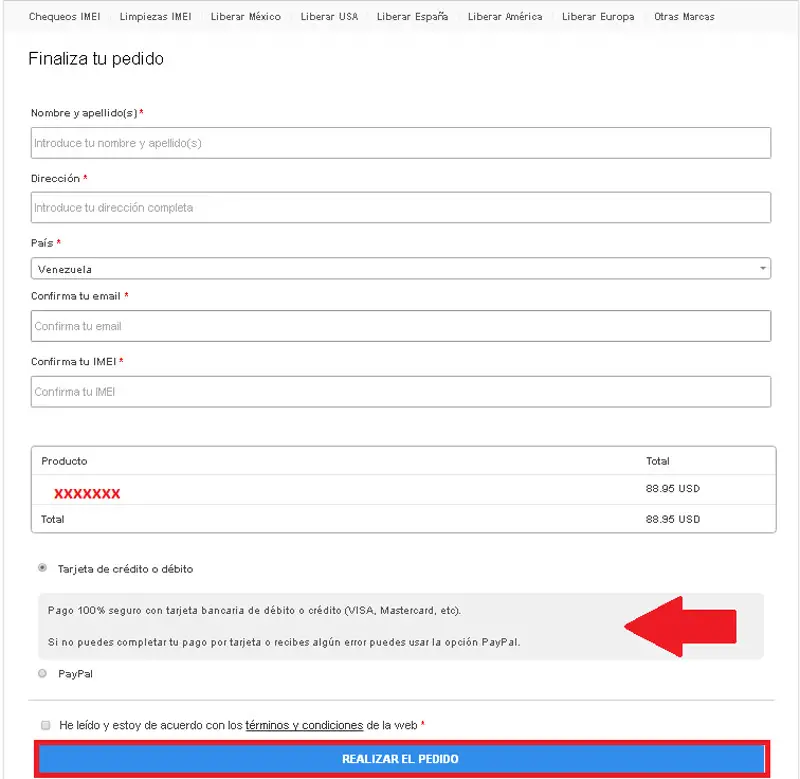 - Ensuite, une fois que vous entrez l’option qui convient à votre situation, la première étape consiste à insérer l’IMEI du smartphone (si vous avez le mobile à portée de main, il vous suffira de taper * # 06 # dans l’application téléphone et le numéro s’affichera dans écran) ainsi que votre adresse e-mail . Dans ce cas, nous avons opté pour la première option qui a un coût de 88,95 USD (* ces prix varient pour l’Espagne) . Vous pouvez payer avec une carte de débit ou de crédit ou si vous préférez avec PayPal, c’est également possible.