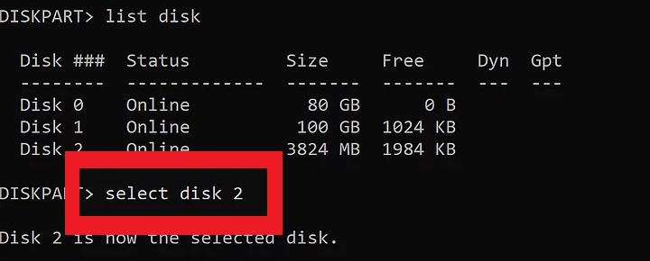 - Une fois que vous avez reconnu votre appareil, il vous suffit de placer dans la section qui dit «Diskpart>», la commande suivante «Select disk» plus le numéro du périphérique de mémoire et appuyez sur Entrée.
