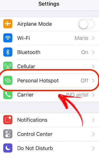 - Ensuite, vous devez retourner dans » Paramètres», et cliquer sur l’option » Partage Internet » , choisir » Point d’accès personnel» et l’activer. Maintenant, si vous êtes prêt à connecter votre Mac au point d’accès » Personal Hotspot» de votre iPhone, accédez- y depuis le menu WiFi.