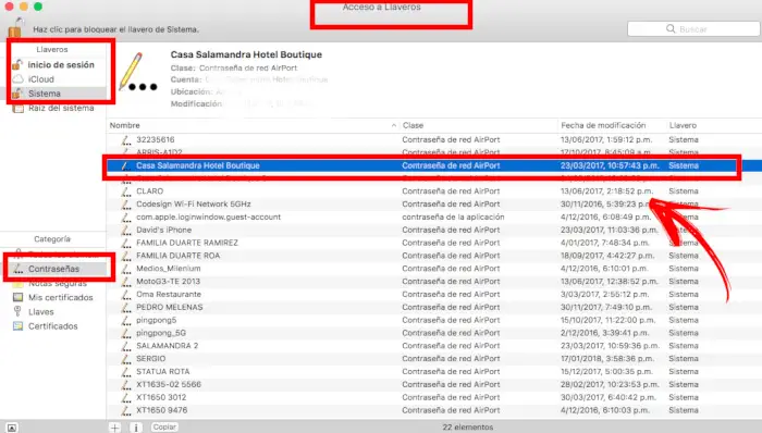 - Une fois la synchronisation prête, vous pourrez voir la clé WiFi de votre iPhone qui vous attend. Pour ce faire, vous devez ouvrir l’application Keychain, soit depuis «Spotlight» (Keychain Access), soit depuis le «Launchpad», en allant dans le dossier » Others» .