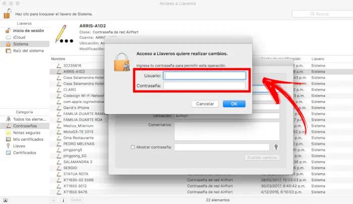 - Cliquez sur le nom du réseau et accédez au trousseau , sélectionnez dans la fenêtre pop-up les détails de l’option sur le réseau que vous avez sélectionné, et choisissez » Afficher le mot de passe «.