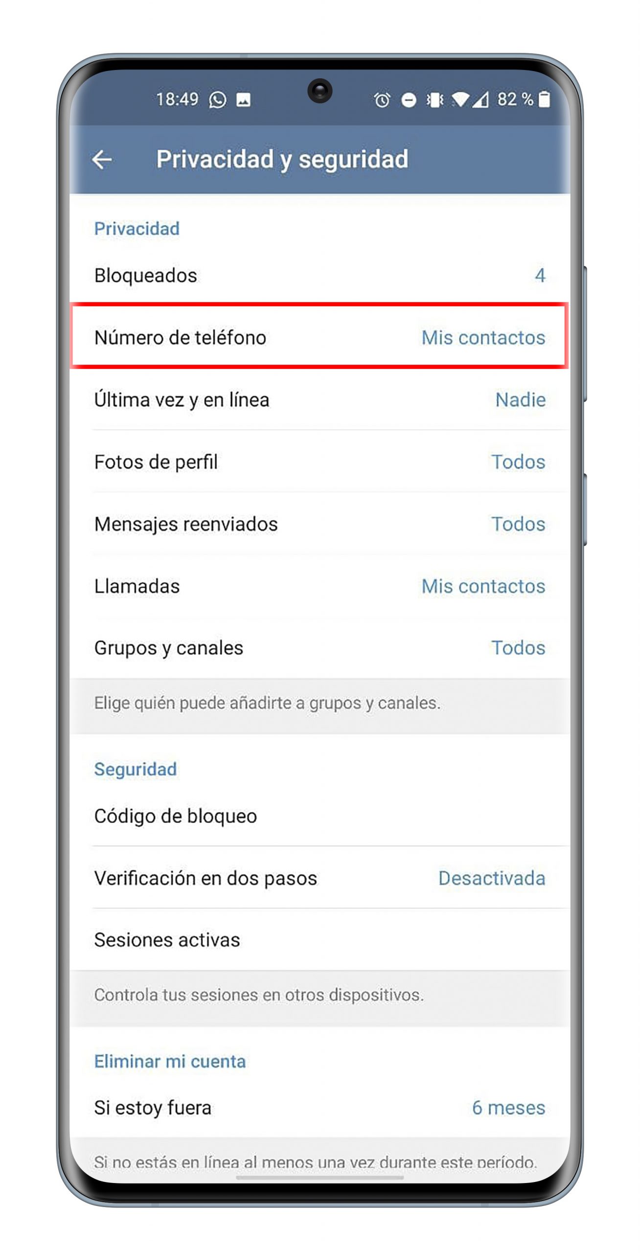 Nous avons déjà mentionné que l’un des grands avantages de Telegram par rapport à WhatsApp est que vous pouvez ajouter d’autres contacts en utilisant uniquement leurs noms. Si vous ne voulez pas non plus que les gens aient accès à votre numéro de téléphone, vous pouvez facilement le masquer afin qu’il n’apparaisse pas sur votre profil.