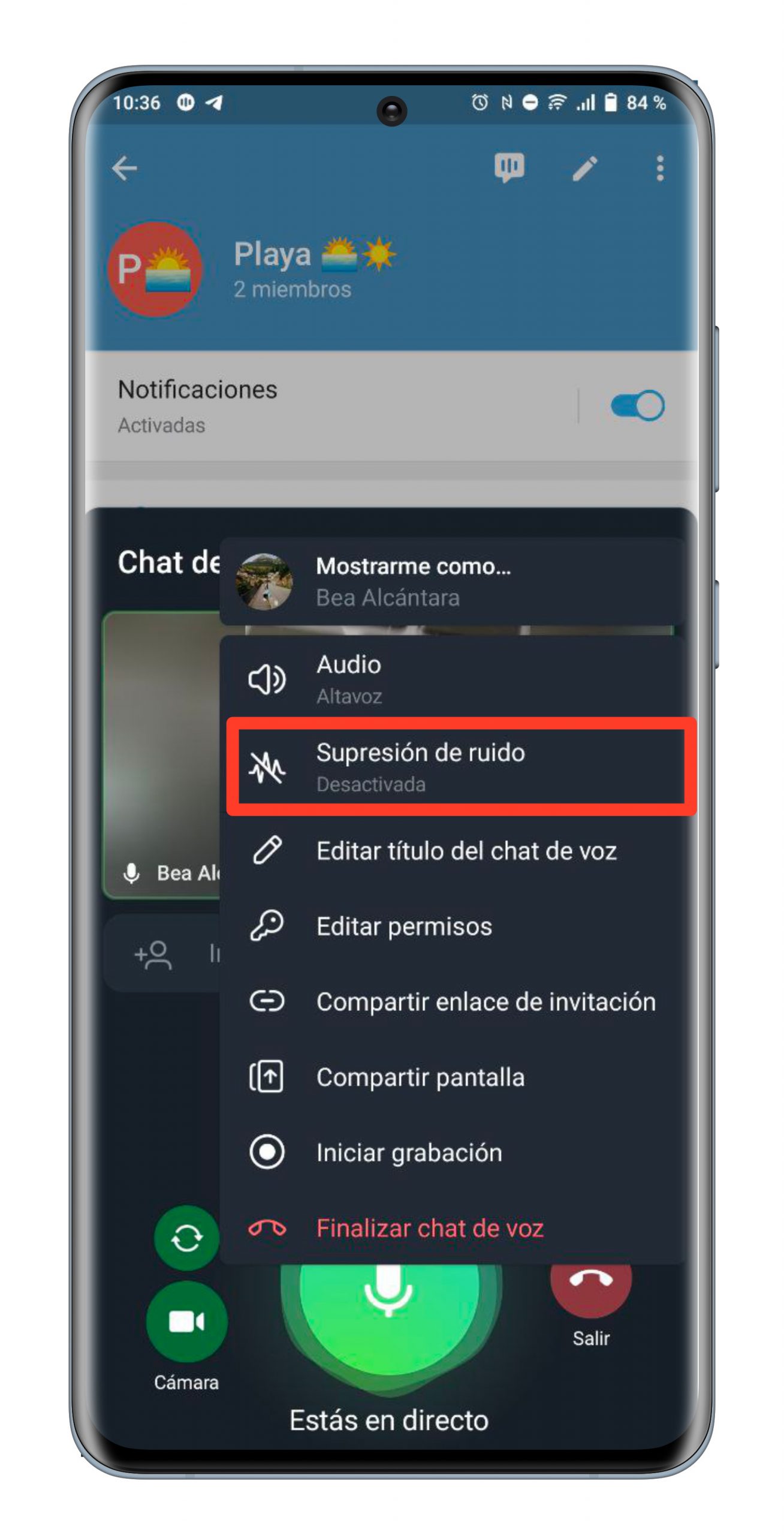 Une autre option que Telegram vous propose est d’activer ou de désactiver la suppression du bruit. Si le son externe est gênant et empêche votre voix d’être entendue clairement et clairement, il vous suffit d’activer cette suppression de bruit. En revanche, si le bruit de l’extérieur est pertinent pour la conversation, vous pouvez désactiver cet outil pour que le reste des participants puisse l’entendre.