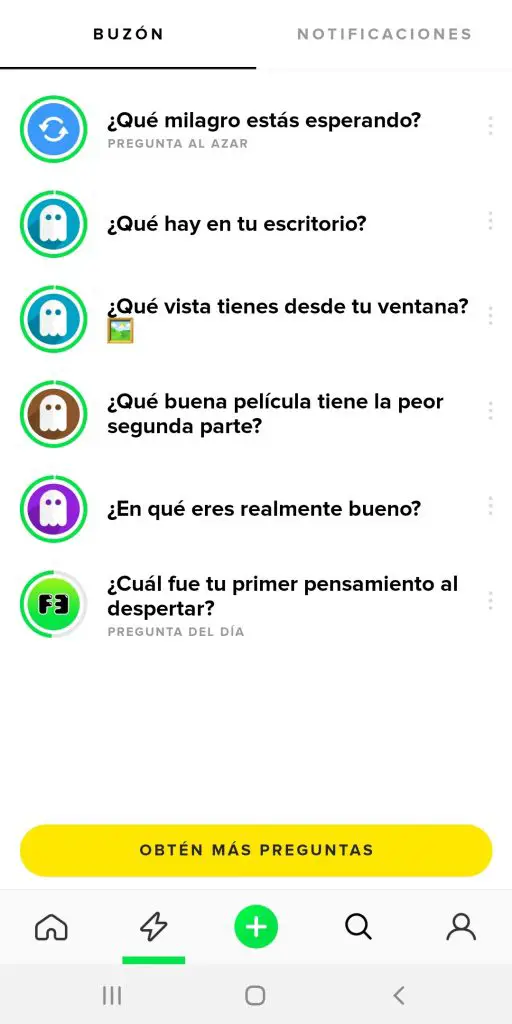 Que sommes-nous qui recevons des questions? Facile. Dans le bouton éclair de la barre inférieure, nous voyons les notifications et nous pouvons y répondre en cliquant dessus. Soit via la caméra mobile, soit avec du texte, mais en général avec un composant d’une plus grande originalité que des plates-formes similaires telles que Ask.fm. Cette réponse sera téléchargée dans notre histoire F3.