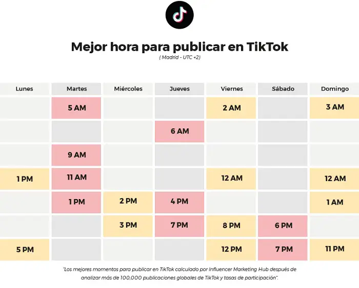 Votre public est-il espagnol ? Eh bien, les heures les plus chargées sur TikTok se situent entre 7 heures de l’après-midi et 12 heures du soir. Actuellement, la plupart des utilisateurs espagnols consomment du contenu TikTok pendant ces heures et surtout le week-end.