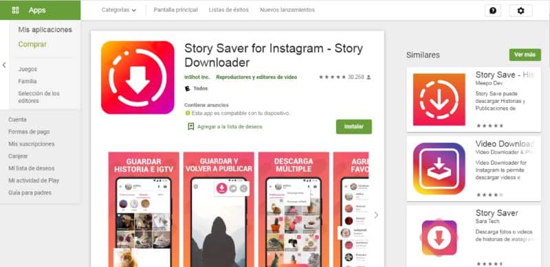 Une fois à l’intérieur du magasin, tapez dans la barre de recherche Story Saver pour Instagram . En cliquant sur le nom qui apparaît dans la liste, vous ouvrirez le menu.