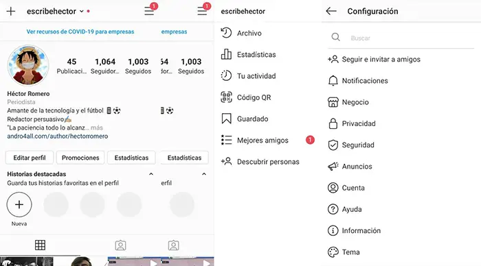 - La première chose à faire est d’ouvrir l’application, d’aller sur votre profil et de toucher le bouton avec les trois points qui se trouve en haut à droite.