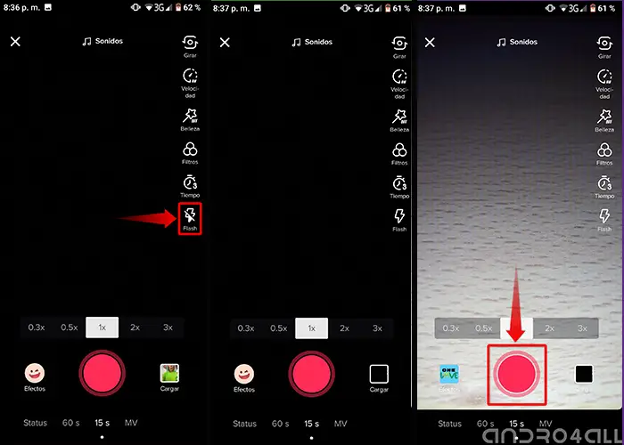 - Pour allumer la lampe de poche sur TikTok: touchez l’icône représentant un éclair et commencez à enregistrer avec plus de lumière à l’aide de la caméra arrière de votre mobile.