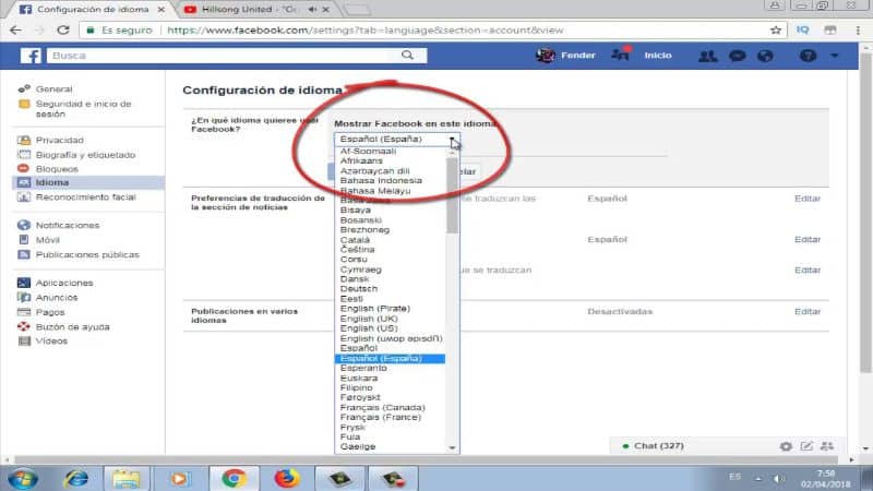 Appuyez sur le lien Langue et région et changez la langue dans la section linguistique de Facebook de l’anglais à l’espagnol, attendez quelques secondes et revenez à la section d’accueil.
