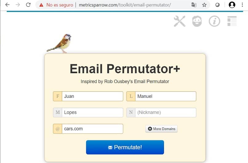 A partir d’une série de données, cette plateforme vous donne un certain nombre d’emails possibles. Cependant, ce n’est pas un outil infaillible . En fait, aucun des e-mails que je vous fournis ne peut appartenir au profil sur lequel vous enquêtez.