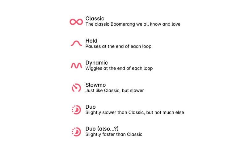 - Dans une icône à l’infini, nous pouvons cliquer et accéder aux modes supplémentaires à l’intérieur du boomerang, nous y trouvons différents effets: ralenti, écho (mal des transports), TV (avec interférence dans l’image) . Vous pouvez sélectionner Ralenti et ainsi créer l’effet combiné des deux.