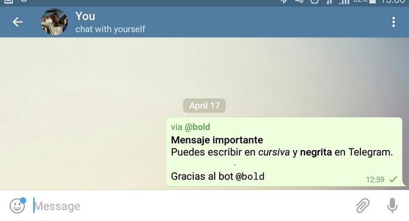 Il est important de placer chaque symbole avant et après chaque mot ou phrase, c’est-à-dire entourer le texte avec les symboles afin que les modifications soient apportées. Vous devez garder à l’esprit que Telegram n’affichera pas les modifications des lettres pendant que vous écrivez le texte, celles-ci seront appliquées lorsque vous enverrez le message; de plus, les symboles ne seront pas affichés dans le texte.