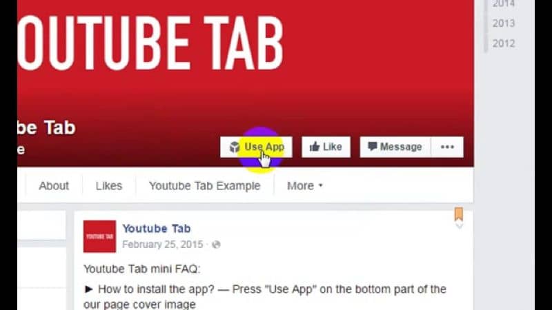 Pour commencer à lier vos comptes, vous devez accéder à vos comptes à partir de votre navigateur, à la fois Facebook et YouTube. Copiez, collez et accédez à l’adresse suivante https://www.facebook.com/youtubetabapp/ . Une fois dans la fanpage de l’application, appuyez sur le bouton Utiliser l’application .