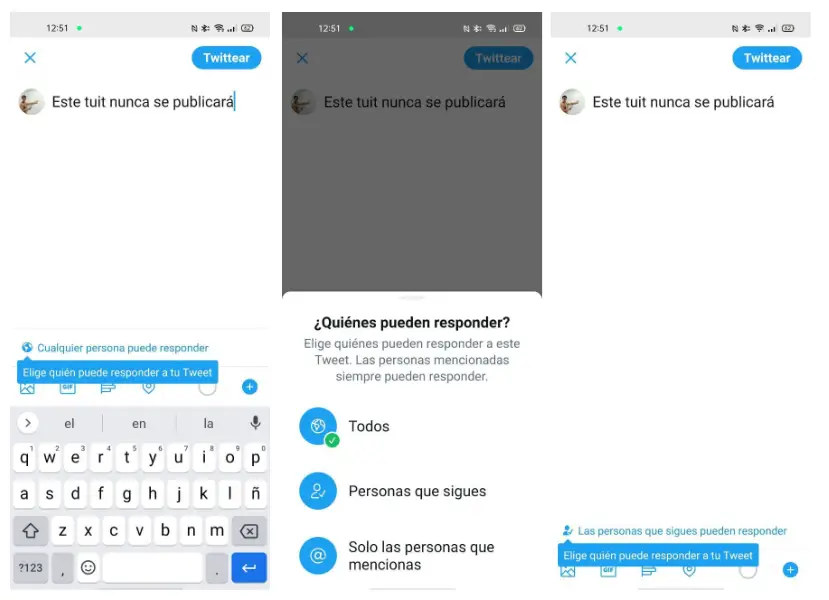 Vous devrez ouvrir le tweet et cliquer sur l’ icône avec les trois points, vous accéderez ainsi aux options du tweet. Là, vous devrez sélectionner «Changer qui peut répondre» et choisir, là encore, entre les trois types d’audiences:
