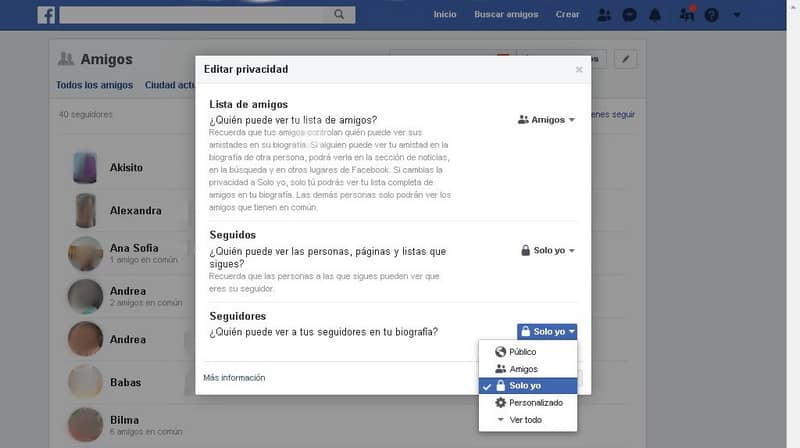 L’option que nous traitons aujourd’hui, à travers cette section, vous pouvez configurer qui peut voir vos abonnés. Comme pour la première option, vous aurez plusieurs options de configuration, adaptez-les à votre goût. Dans tous les cas, nous vous recommandons de sélectionner Uniquement moi si vous ne souhaitez montrer cette liste à personne.