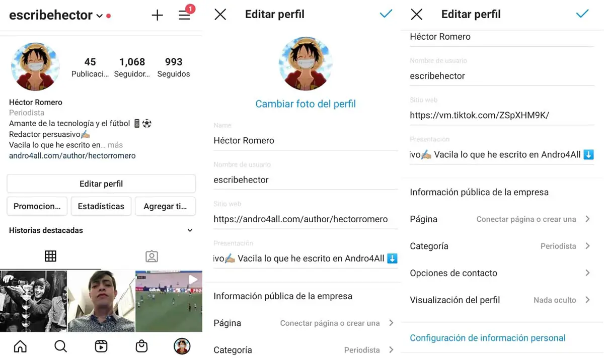 - Placez le lien où il est écrit Instagram. Si vous ne savez pas comment obtenir le lien vers votre biographie, ouvrez l’application Instagram, connectez-vous depuis un autre compte, accédez à votre profil, touchez le bouton avec les trois points en haut à droite puis «Copier l’URL du profil».