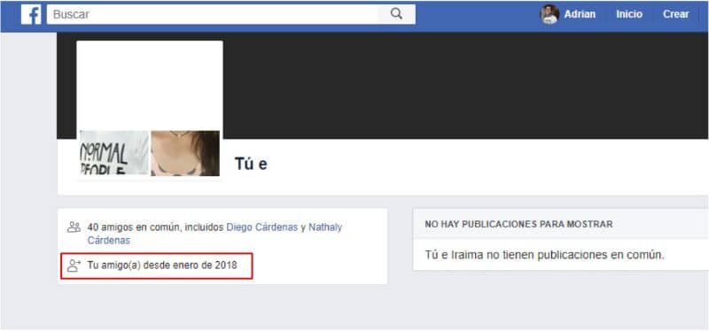 Une fois cette étape effectuée, vous pourrez voir la date à laquelle ils sont devenus amis, elle est exprimée en mois et en année. De plus, le nombre d’amis communs , la ville et les publications qui ont été faites dans leur biographie ou étiquetés sont affichés .